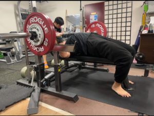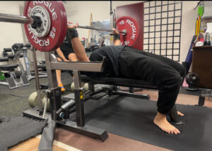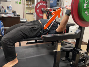 胸椎伸展させて肩甲骨上部や肩後部、後頭部のみ接しているブリッジを組むことで背中の接地面積を減らし、ベンチプレス動作で肩甲骨を動かすスペースができ、結果的に強く押せる形になります。