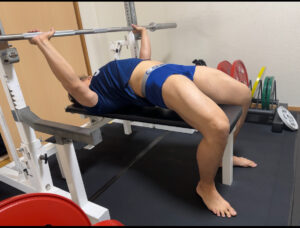 ベンチプレスのブリッジで足の踏ん張り~胸椎伸展を実感する上でケツ上げベンチプレスがおススメです。