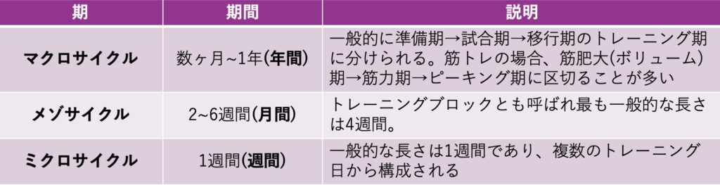 年間(マクロサイクル)→月間(メゾサイクル)→週間(マイクロサイクル)というように、区切りが大まかなものから細分化しているものと理解できると良いでしょう。