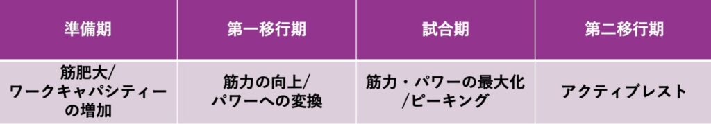 この方法をとることで、筋力・パワーを最大化させたい試合に向けて、段階的に強度を上げつつ、中上級者に起きがちな刺激のマンネリ化を防ぐことができると考えられます。