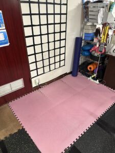 ストレッチマットエリア、ストレッチポール、フォームローラー複数、骨盤職人、ゴムバンド類、ケア用ボール類など