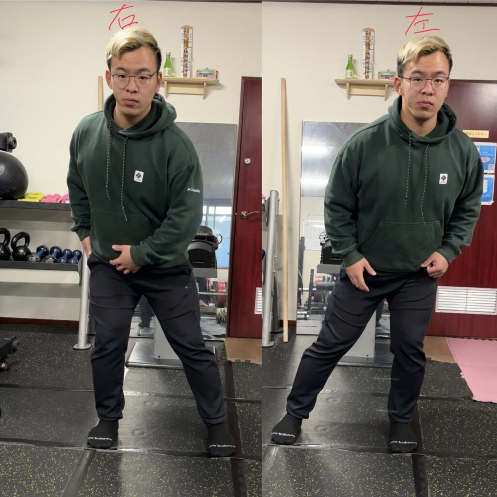 このように、左右と真ん中のグラデーションを学習した上で、いざ高重量を両足で押すという課題が課されれば、自然と両側の脚である程度均等に地面を押すことげできるようになるでしょう。