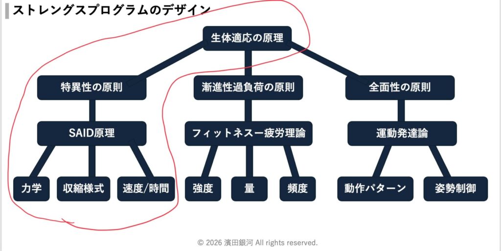 そこで、このPOF法が筋力を高めるストレングストレーニングにおいてどこに位置するのかを整理する必要があります。